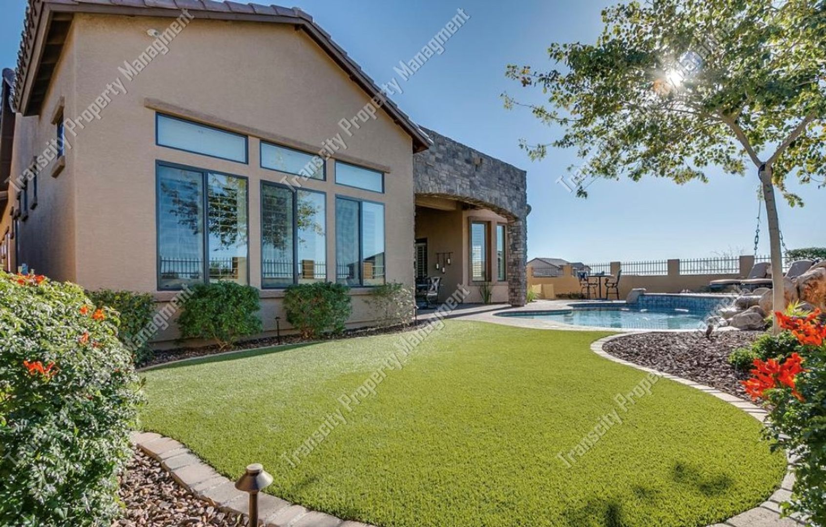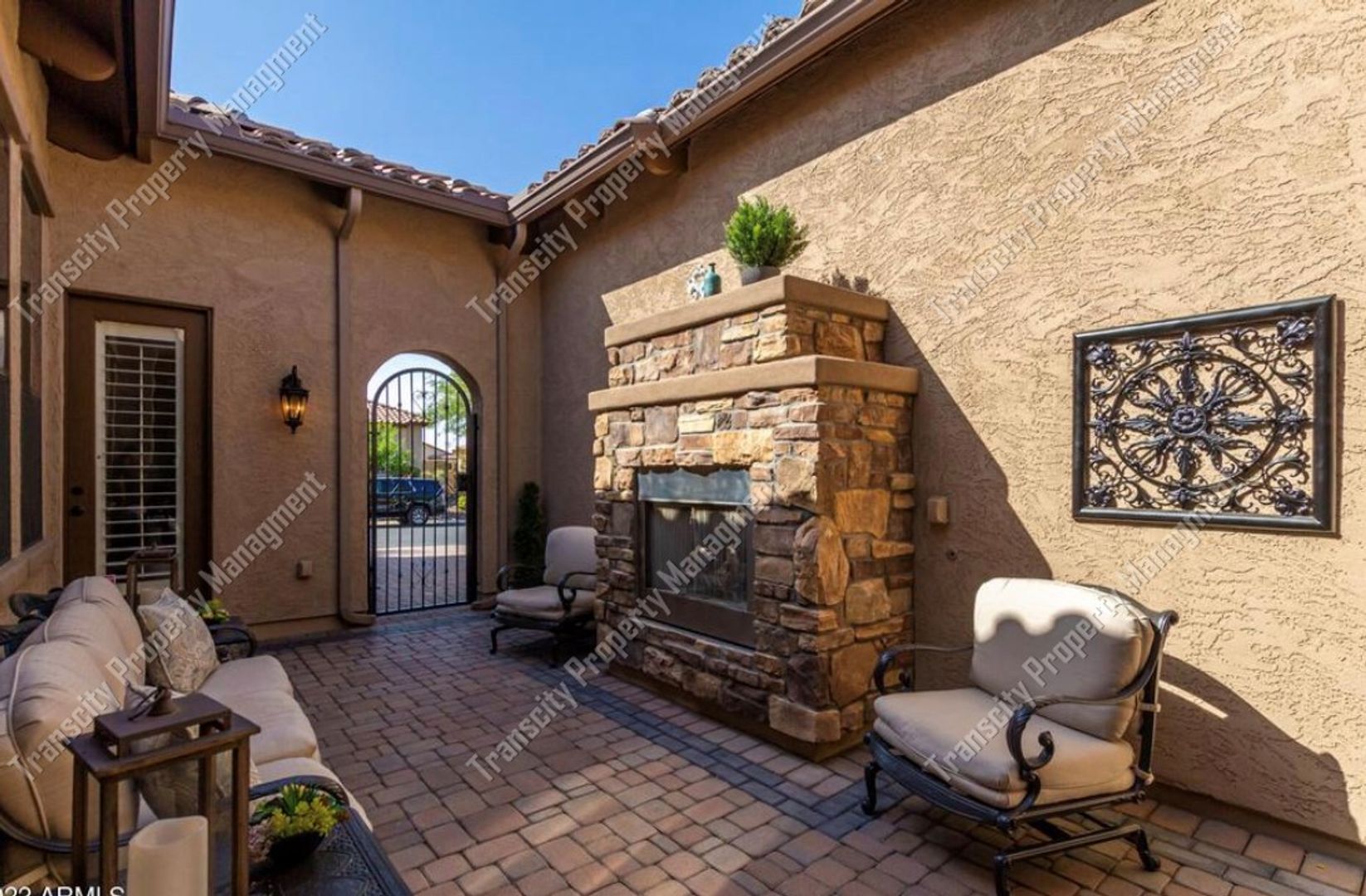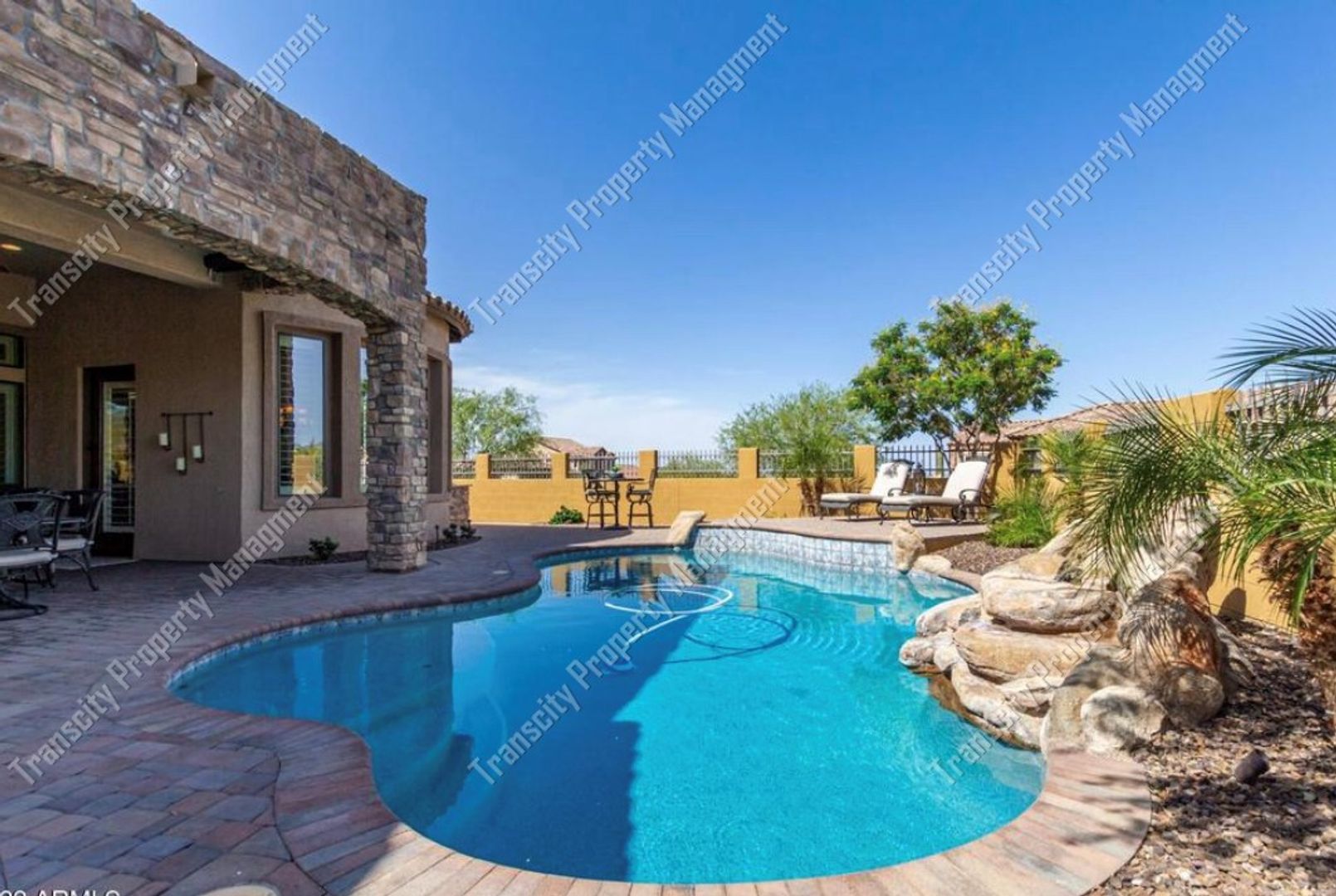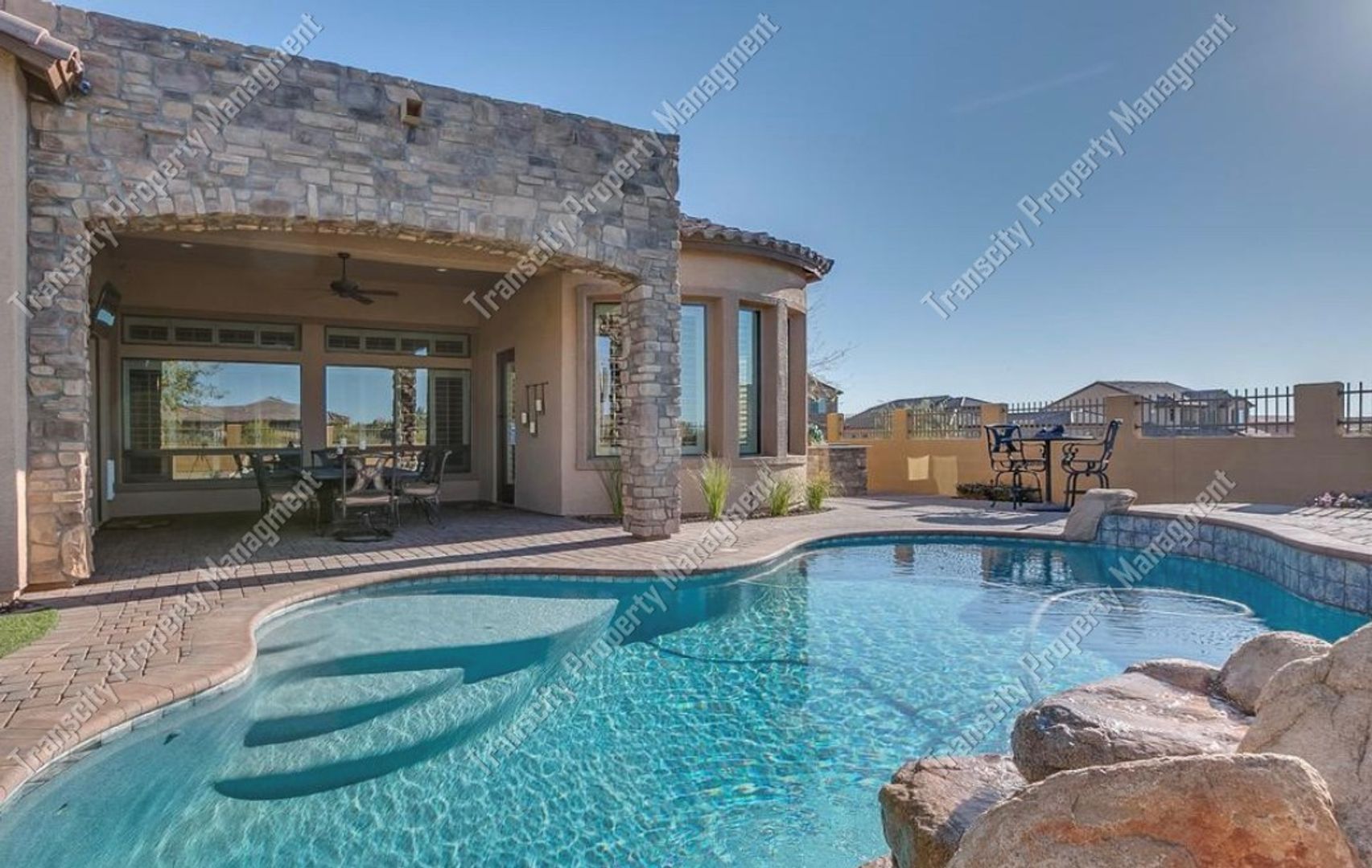 One of Mountain Bridge's Finest homes-- IMMACULATE 3BR + Bonus Room, 3.5 BA, 3 car garage. Customized designer home. North/South PREMIUM corner lot. City light, sunset & mountain views. Resort-like backyard with a stunning pool with rock waterfall, built-in BBQ, sink, and granite counter. Pavers and hardscape, turf & huge covered patio designed for entertaining enjoyment.. Elegant courtyard entry with gas fireplace. Impressive iron front door. Gourmet kitchen, upgraded cabinets, new Taj Mahal Quartzite counters, large island, walk-in pantry, upgraded appliances & custom backsplash - all open to the beautiful dining area and great room. Gorgeous owner's suite with patio access, 2 closets, soaking tub, and rain shower. Amazing bonus room with wood tile floors & separate entrance from the courtyard! The home can be rented partially furnished.