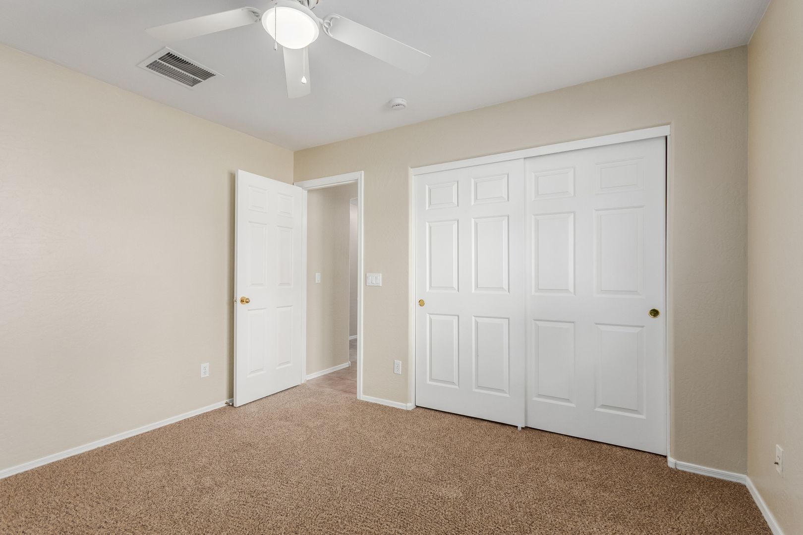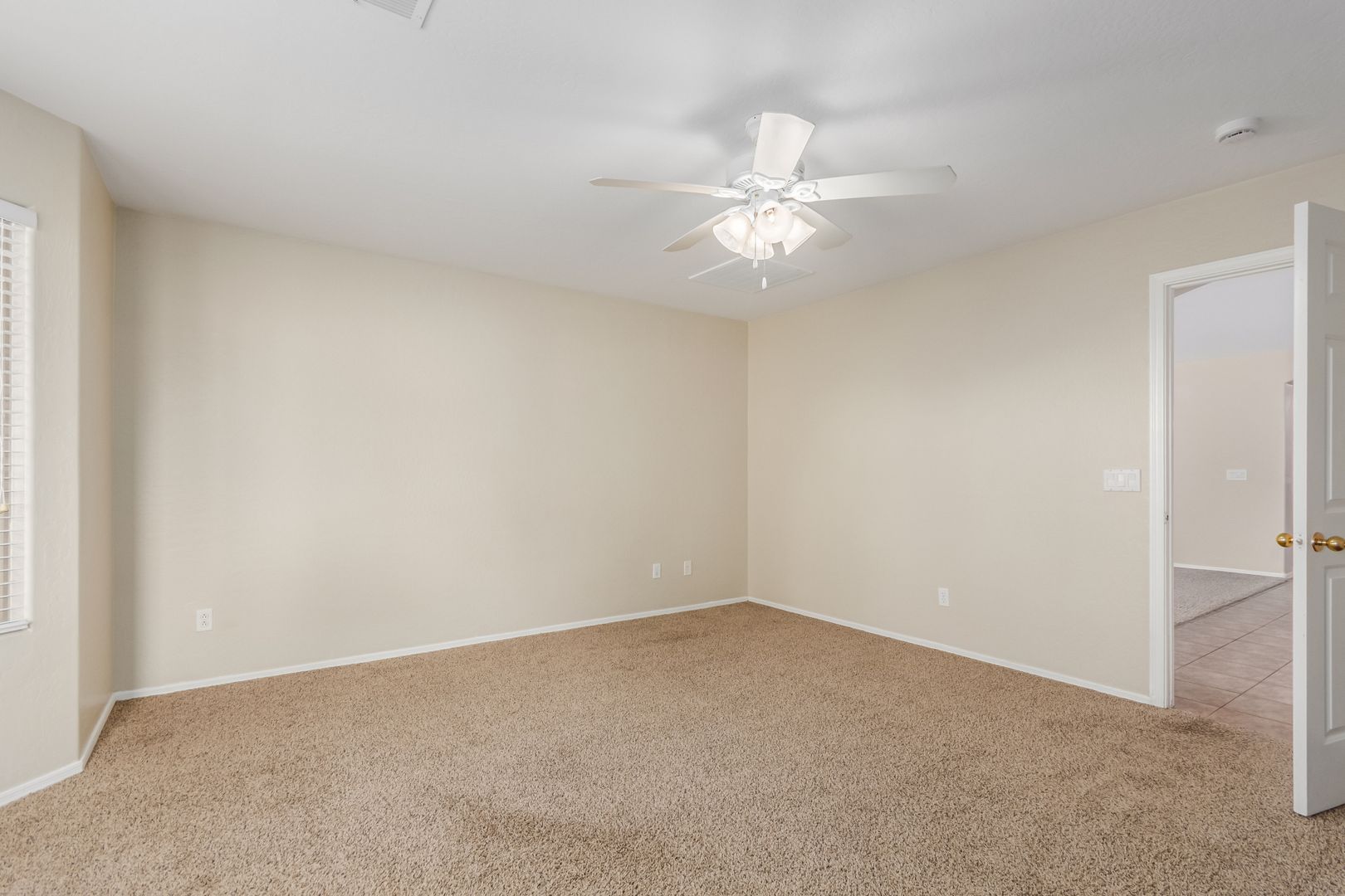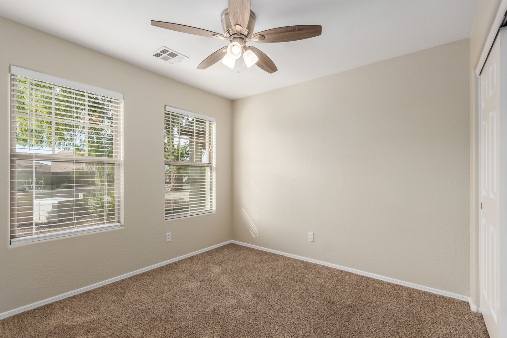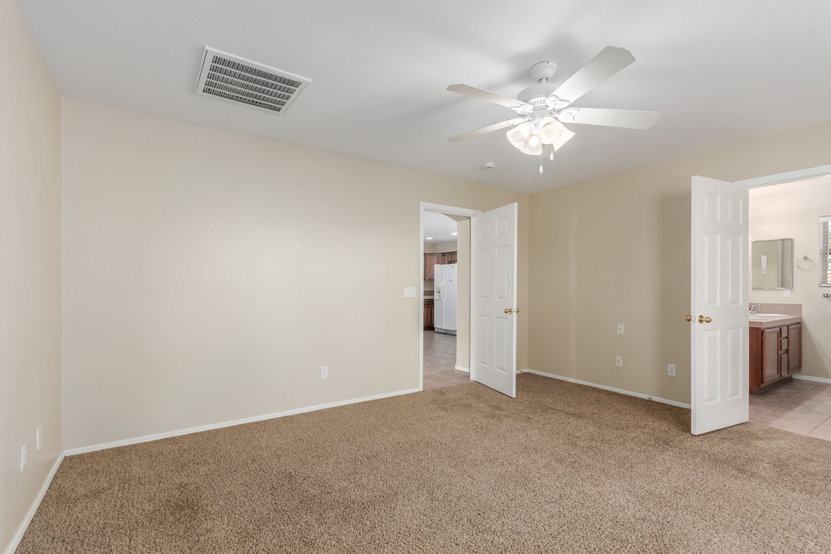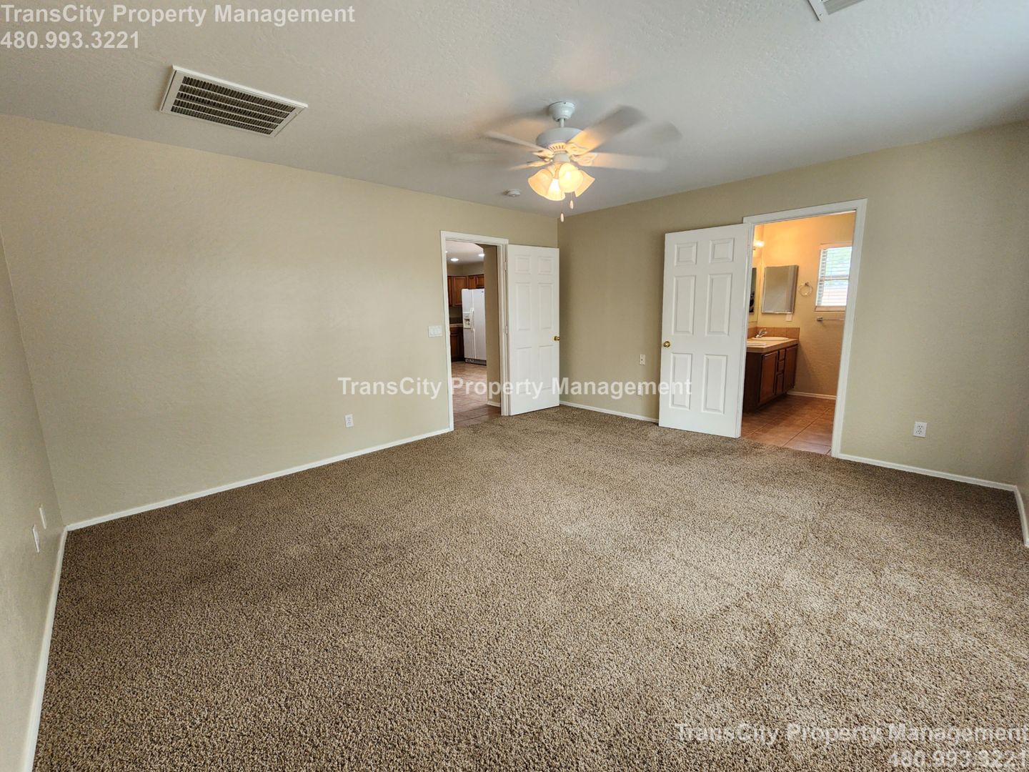 The front yard features low-maintenance desert landscaping. Inside, tile and carpet flow throughout the split floor plan, with three bright, well-sized bedrooms on one side and a private master suite on the other. The primary bedroom includes a roomy walk-in closet and a bathroom with dual sinks, great lighting, and ample storage.