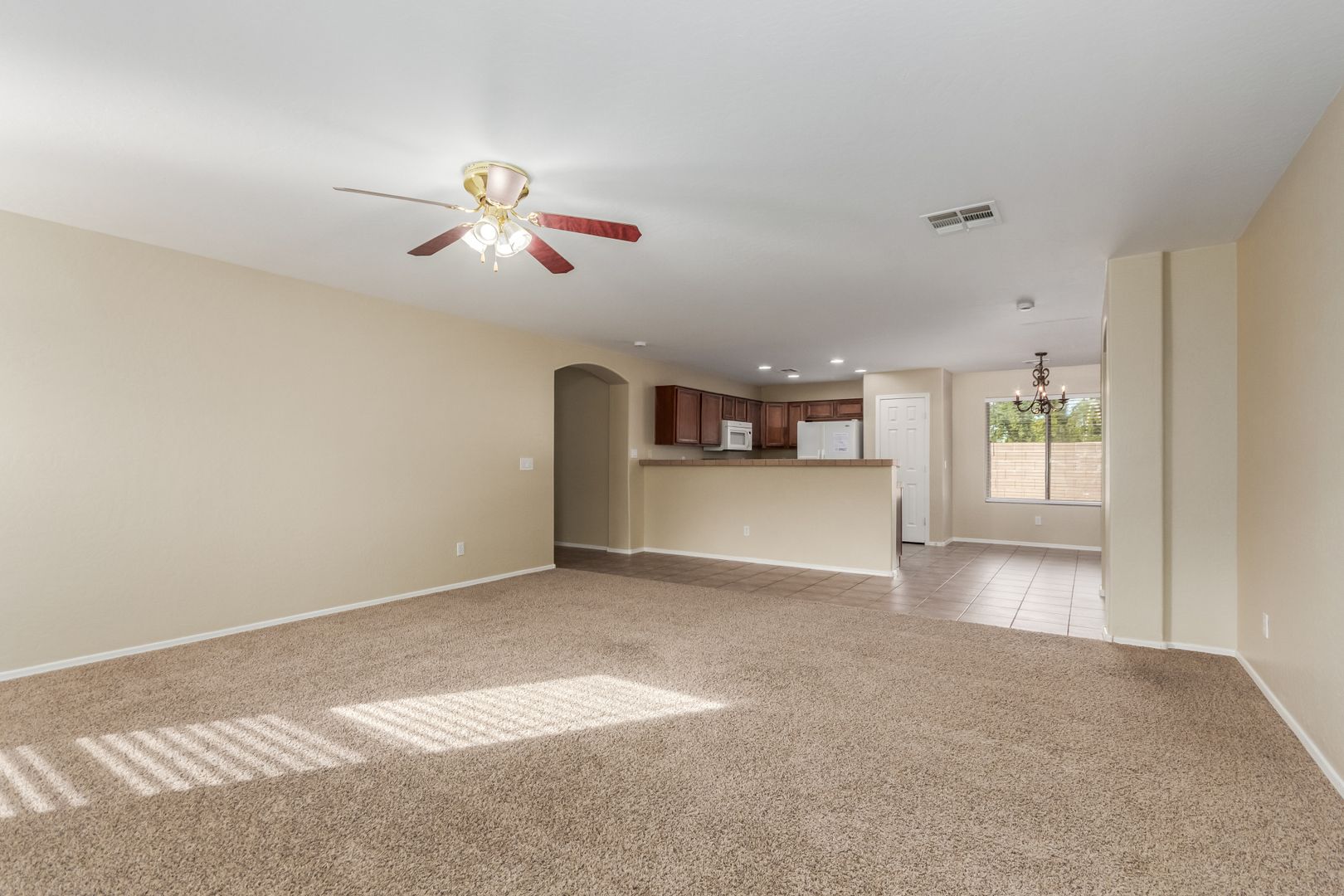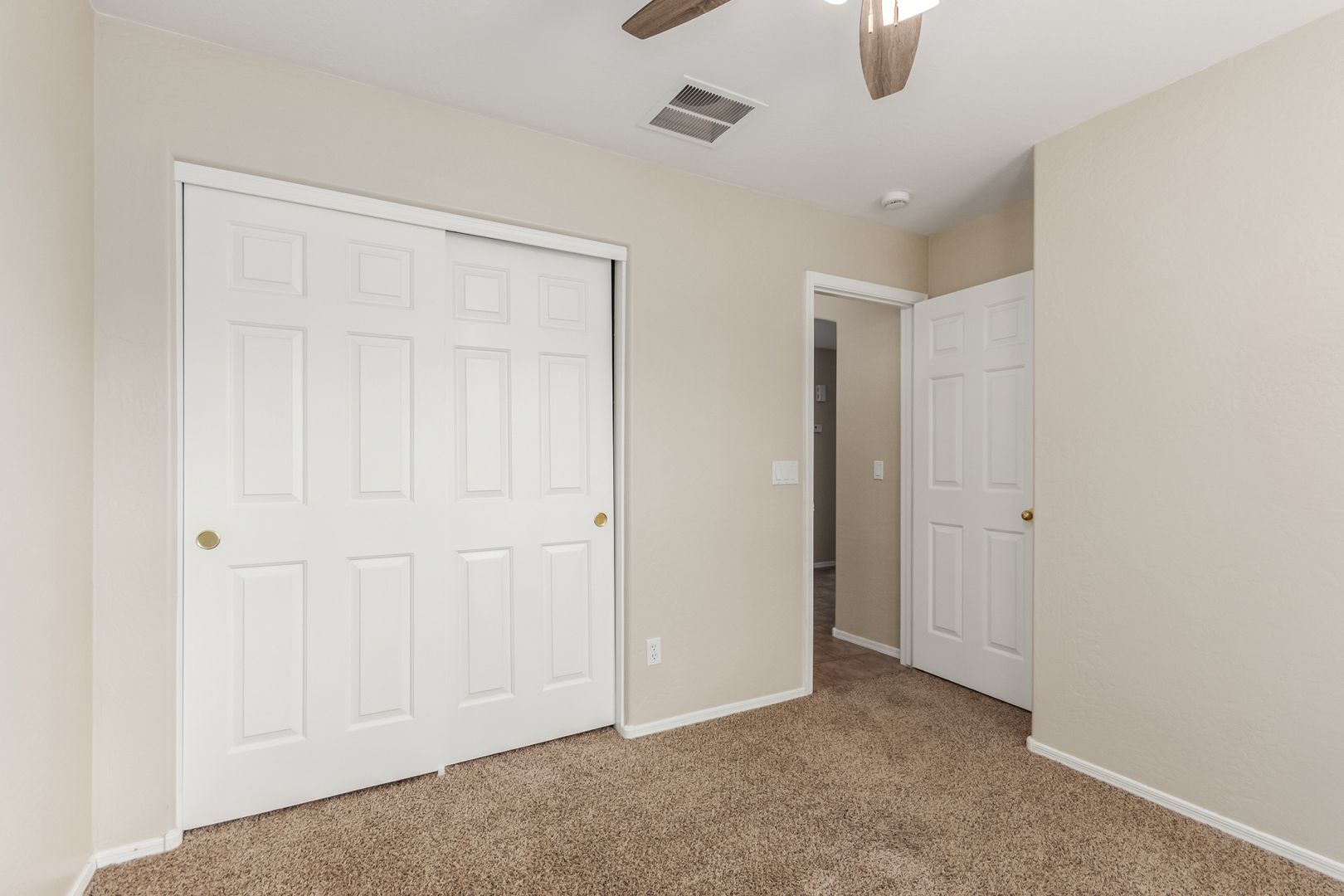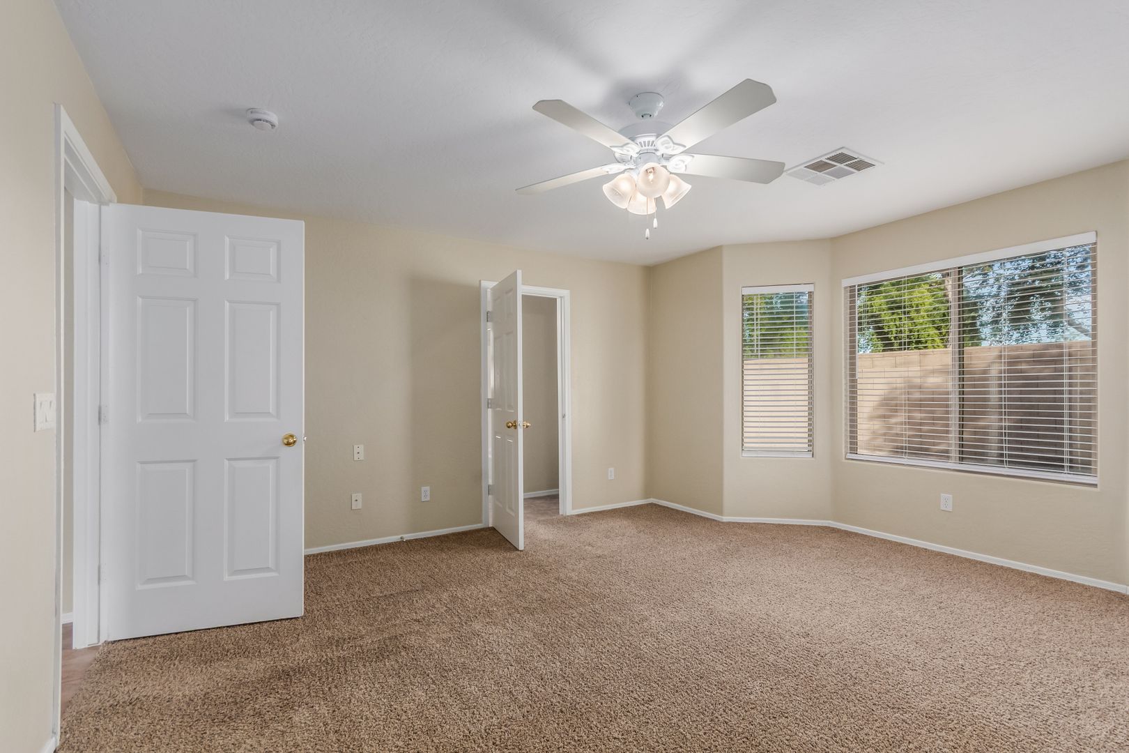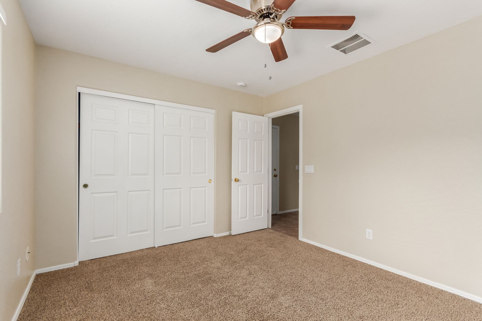 The front yard features low-maintenance desert landscaping. Inside, tile and carpet flow throughout the split floor plan, with three bright, well-sized bedrooms on one side and a private master suite on the other. The primary bedroom includes a roomy walk-in closet and a bathroom with dual sinks, great lighting, and ample storage.