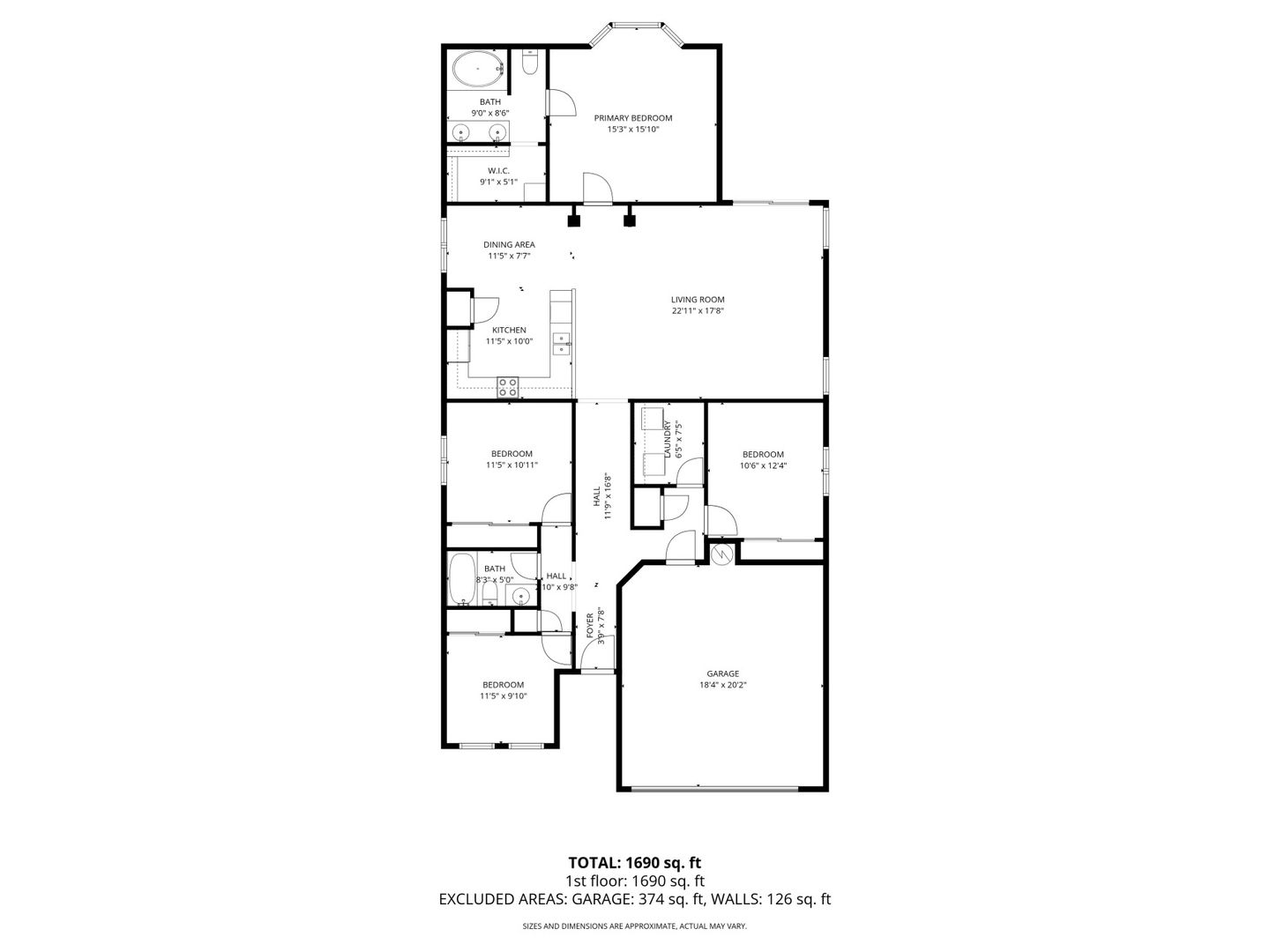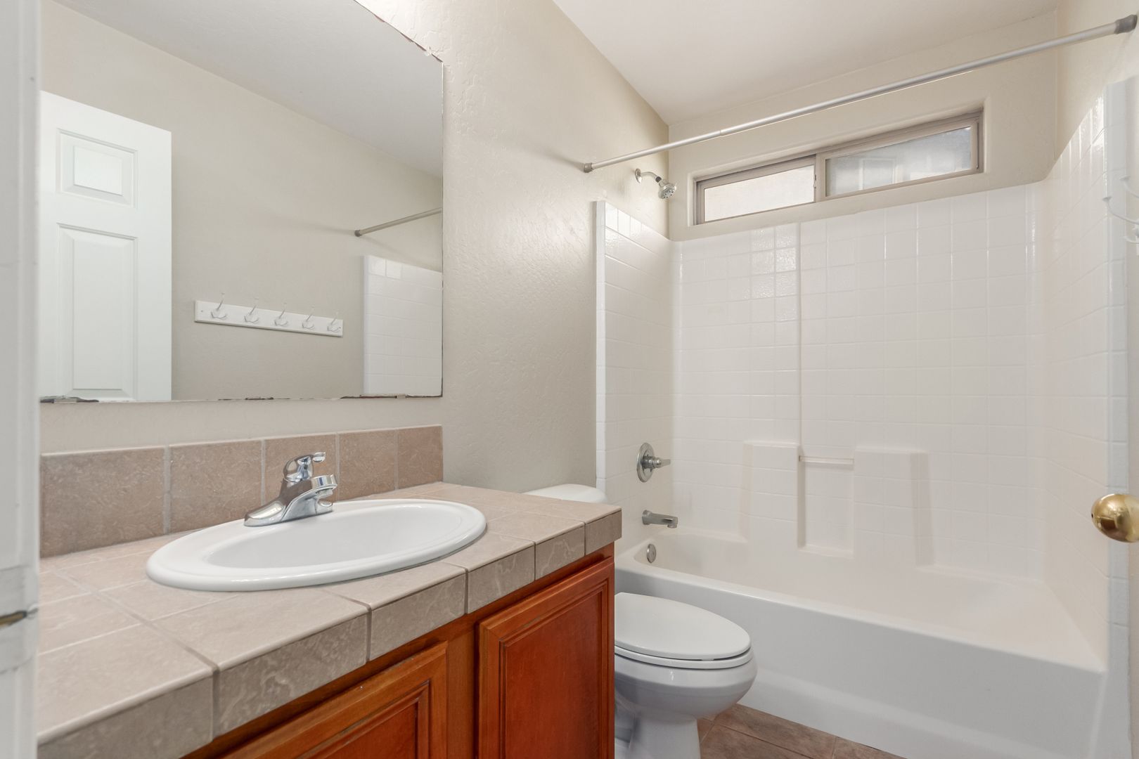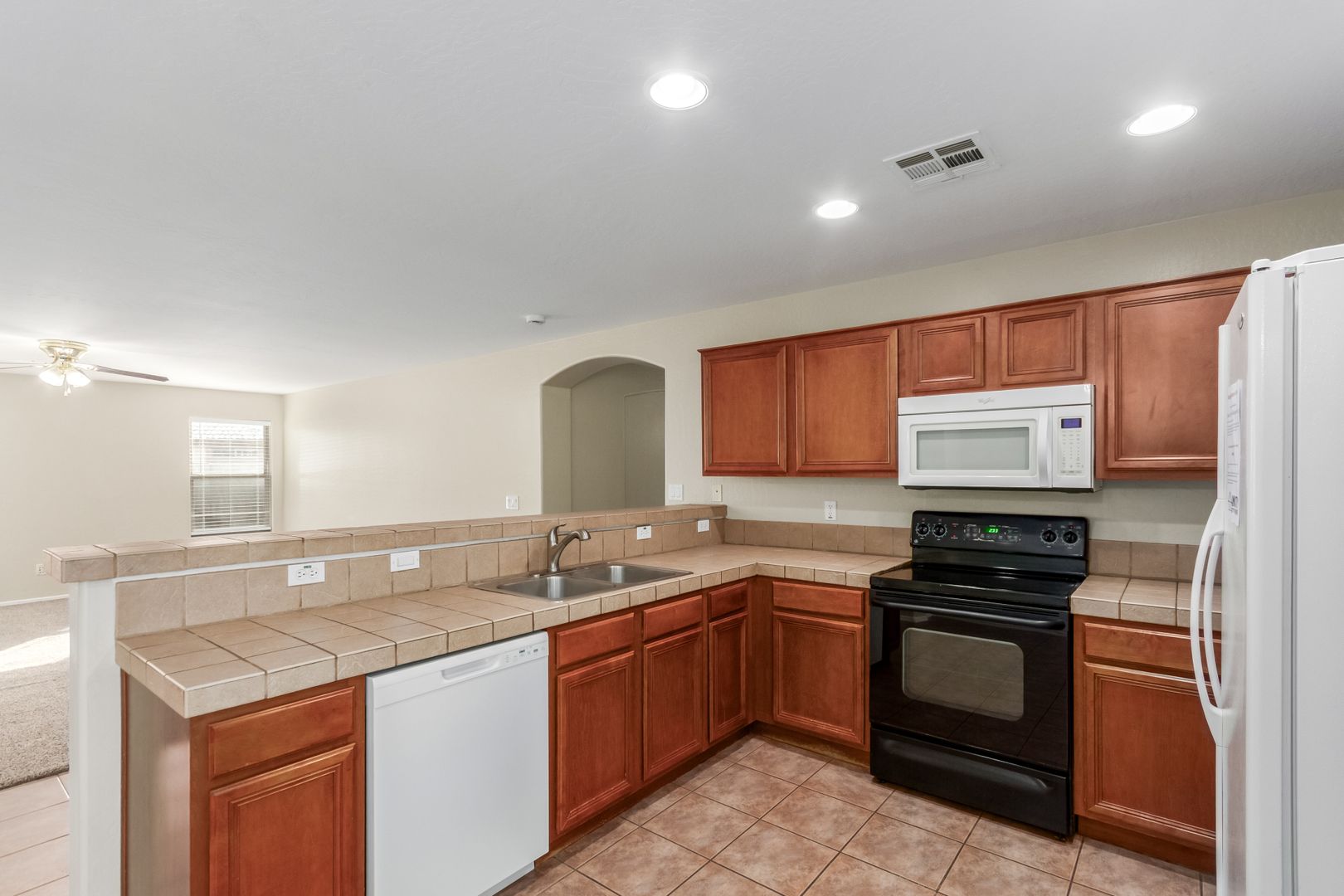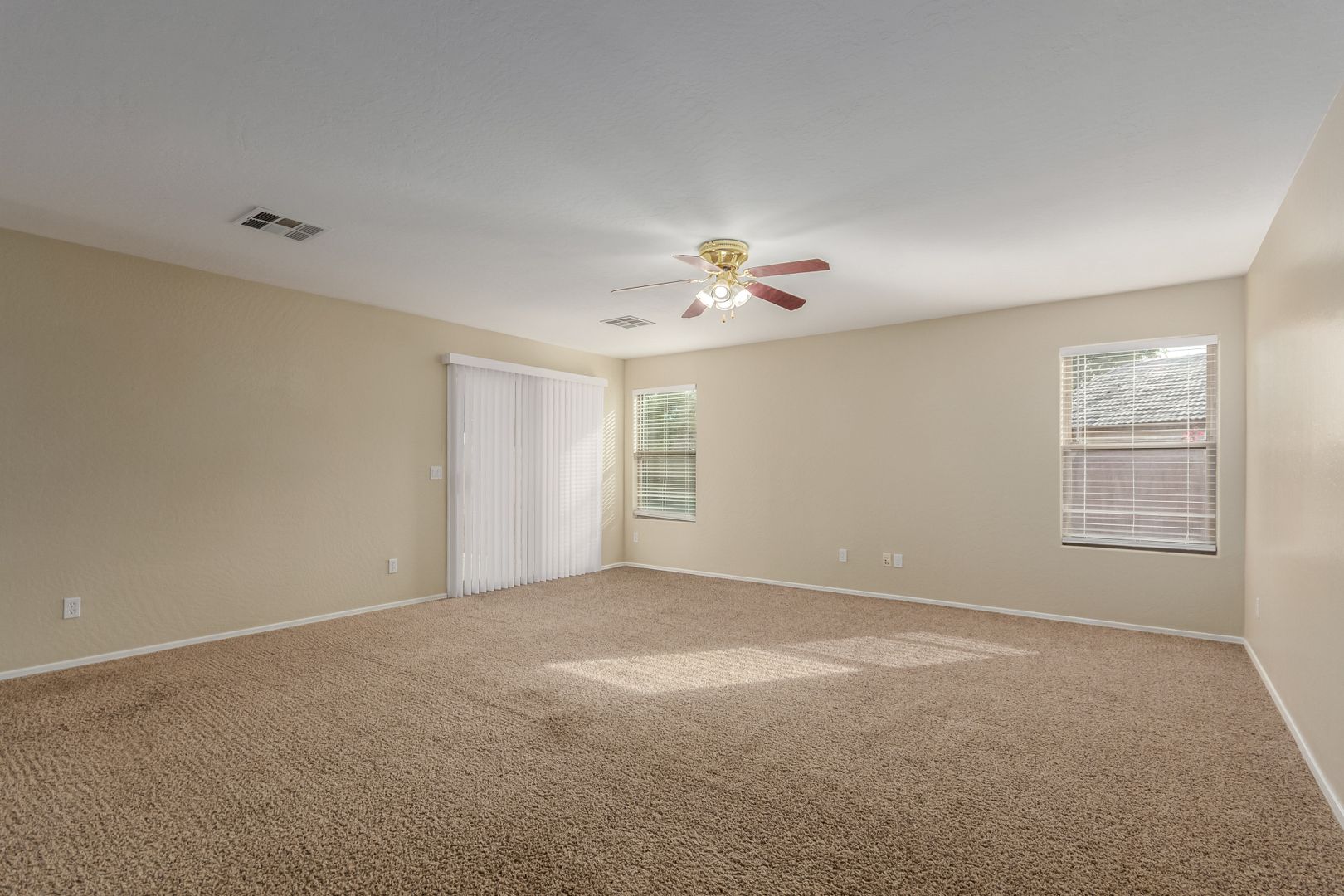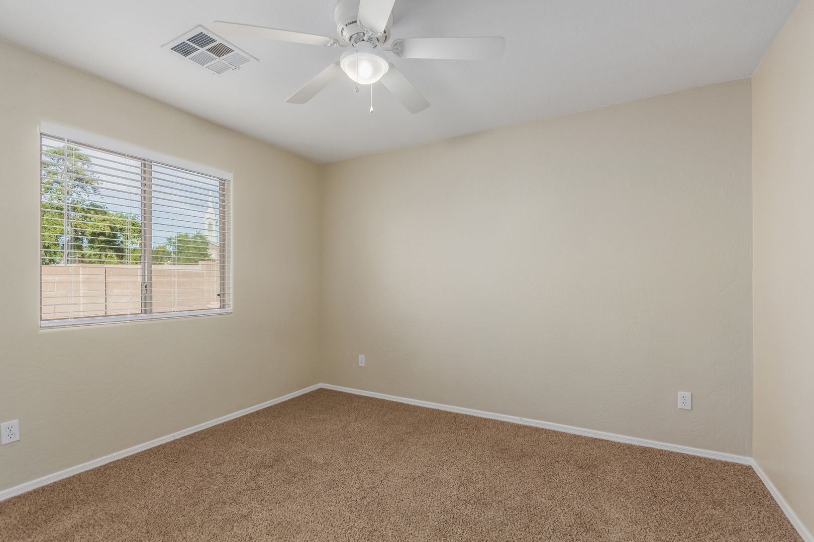 The front yard features low-maintenance desert landscaping. Inside, tile and carpet flow throughout the split floor plan, with three bright, well-sized bedrooms on one side and a private master suite on the other. The primary bedroom includes a roomy walk-in closet and a bathroom with dual sinks, great lighting, and ample storage.