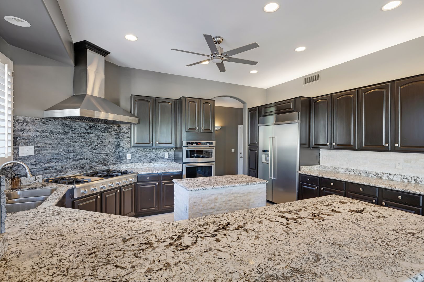 Open floor plan with vaulted ceilings, formal living and dining areas, wet bar, and French doors to the backyard. Chef’s kitchen includes custom cabinetry, breakfast bar, walk-in pantry, and upgraded appliances with Thor gas cooktop. Family room with fireplace opens to outdoor space.