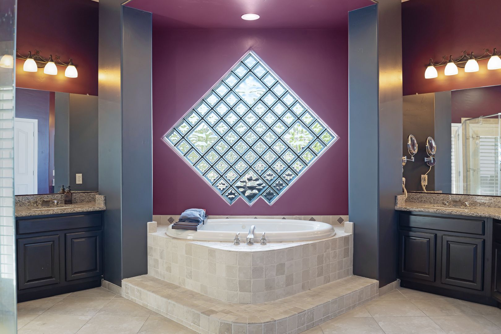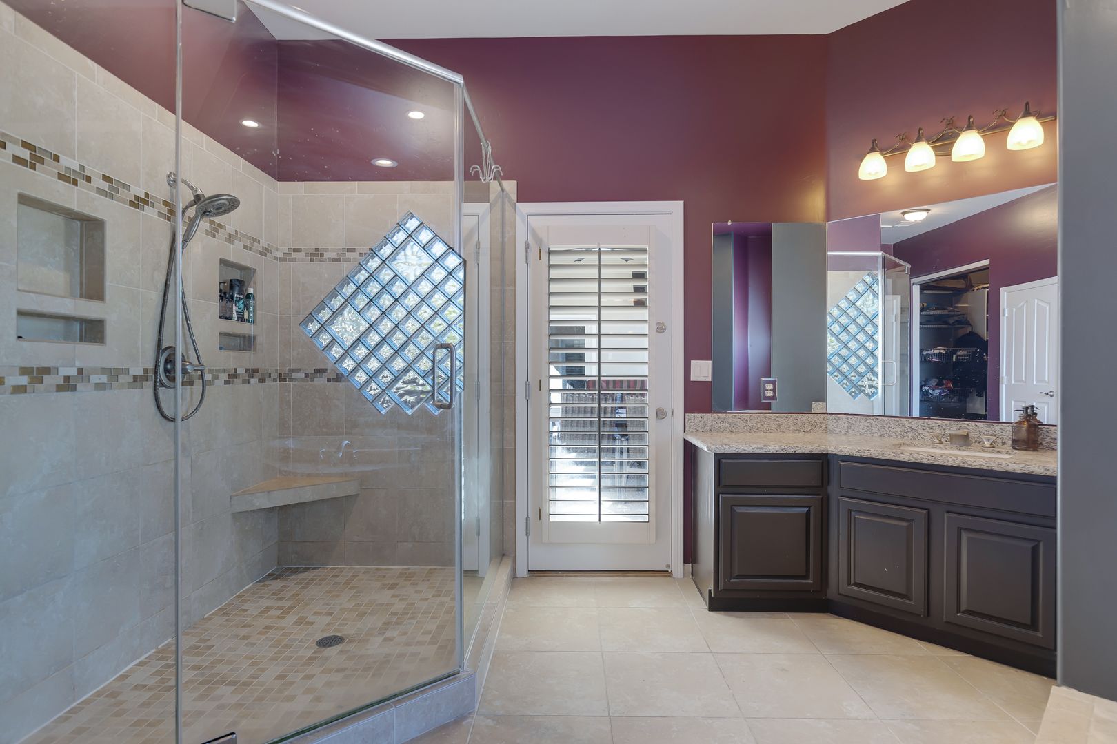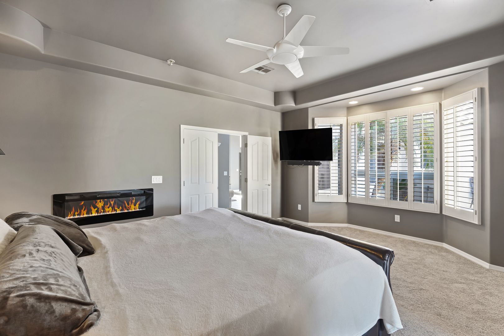 Split floor plan with spacious primary suite featuring sitting area, two walk-in closets, electric fireplace, and backyard access. Primary bath includes jetted tub, walk-in shower, and double sinks. Three additional bedrooms and two baths, including Jack-and-Jill.